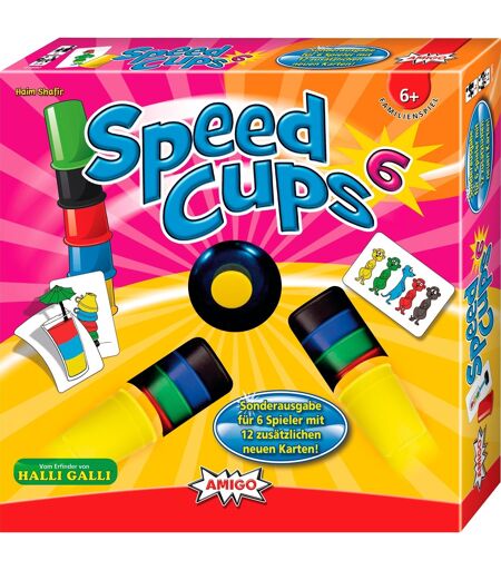 Bei "Speed Cups 6" erhält jeder Spieler 5 bunte Cups. Die Karten und die Klingel kommen in die Tischmitte. Die Karten geben vor, ob die Cups neben- oder aufeinander angeordnet werden. In welcher Reihenfolge steigen die Luftballons in den Himmel? Wurden die Cups richtig angeordnet, schnell auf die Glocke hauen, und sich die Karte schnappen - denn der Spieler mit den meisten Karten gewinnt! Diese Sonderedition ist für bis zu 6 Spieler geeignet und beinhaltet 12 neue Aktionskarten. ...
