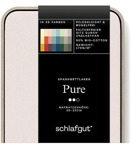 Dehnbar, blickdicht und straff: Unser Pure Spannbettlaken aus fließender Bio-Makobaumwolle und 5% Elasthan lässt sich einfach beziehen und bleibt schön faltenfrei – auch nach dem Schlafen. Und ganz gleich in welcher Farbe, es ist Made in Green – sagt auch Oeko-Tex®. Material: 95 % gekämmte Bio-Baumwolle und 5 % Elasthan - gleichmäßige, blickdichte Oberfläche und straffer, faltenfreier Sitz 5 % Elasthan - passt auch 220cm lange Matratzen Reaktivfärbung bis tief in die Faser - farbecht auch nach vielen Waschgängen mit Antipilling-Ausrüstung - keine Fusseln original Fulflex-Gummi - bleibt in Form pflegeleicht - trocknergeeignet und bügelfrei mittelschwere Qualität - Flächengewicht: ca. 170g / m2 »Made in Green« by OEKO-TEX® - schadstoffrei und umweltfreundlich Carefully designed in Germany Maximale Matratzenhöhe: bis 30 cm S - Passend für 90x190cm bis 100x220cm. ...