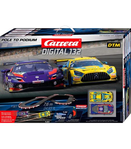 Das Carrera-Set DIGITAL 132 Pole to Podium ist eine spannungsgeladene Herausforderung für jeden Rennsportbegeisterten. Mit dem eleganten Ferrari 296 GT3 "Emil Frey Racing, No.14" und dem kraftvollen Mercedes-AMG GT3 Evo "Mercedes-AMG Team HRT, No.4" wird die DTM 2023 hautnah erlebbar auf einer beeindruckenden Strecke von 7,6 Metern Länge. Ausgestattet mit spannenden Spurwechseln und Beleuchtung, liegt der Motorsportzauber in der Hand von bis zu 6 Fahrern - und das buchstäblich, denn die mitgelieferten Wireless Controller ermöglichen volle Bewegungsfreiheit und intuitive Steuerung. Steuere die Modelle dieser Rennlegenden und führe sie von der Pole Position zum Podium! ...