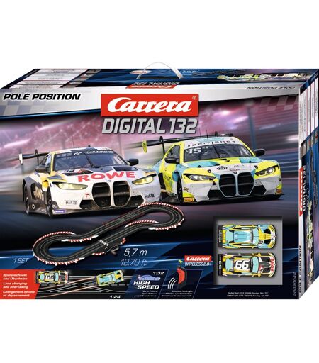 Starte deine Motoren mit der DIGITAL 132 Pole Position! Mit einer Streckenlänge von 5,7 Metern bietet dieses Slotracing-Set von Carrera spannende Rennerlebnisse für bis zu 6 Fahrer. Steuere den BMW M4 GT3 "ROWE Racing, No.99" und den BMW M4 GT3 "RAM Racing, No. 15" British GT 2024L1 für packende Duelle auf der Überholspur. Die Spurwechsel-Funktion erlaubt atemberaubende Manöver, während die Wireless Controller die Freiheit geben, das Rennen aus jeder Perspektive zu dominieren. Mit der Carrera-Rennbahn DIGITAL 132 Pole Position bist du nicht nur Zuschauer, sondern Teil des Nervenkitzels! ...