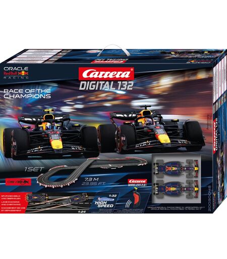 Starte deine Motoren mit der DIGITAL 132 Race of the Champions! Mit einer Streckenlänge von 7,3 Metern bietet dieses Slotracing-Set von Carrera spannende Rennerlebnisse. Steuere den Oracle Red Bull Racing RB20 "M.Verstappen, No.1" und den Oracle Red Bull Racing RB20 "S.Perez, No.11" für packende Duelle auf der Überholspur. Die Spurwechsel-Funktion erlaubt atemberaubende Manöver, während die Wireless Controller die Freiheit geben, das Rennen aus jeder Perspektive zu dominieren. Mit der Carrera-Rennbahn DIGITAL 132 Race of the Champions bist du nicht nur Zuschauer, sondern Teil des Nervenkitzels! ...