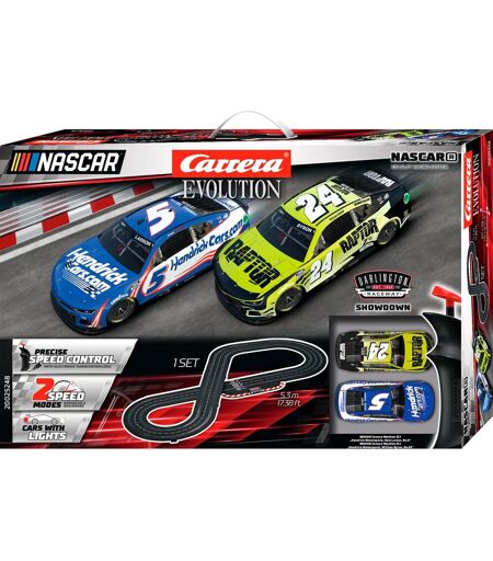 Greif Dir den Controller und erlebe das Carrera EVOLUTION NASCAR Darlington Showdown - das Rennbahn-Set, das pure Spannung für zwei Spieler bringt. Tritt mit den Modell-Fahrzeugen NASCAR Camaro NextGen ZL1 "Hendrick Motorsports, Kyle Larson, No.5" und NASCAR Camaro "Hendrick Motorsports, William Byron, No.24" in das ultimative Rennerlebnis ein und genieße Highspeed und Nervenkitzel auf einer Streckenlänge von 5,3 Metern. Dank der Drift-Funktion kannst du die Kurven mit spektakulärem Fahrstil nehmen und den Gegner beeindrucken. Mach dich bereit, an die Grenzen zu gehen und bei jedem Rennen aufs Neue zu zeigen, wer auf der Strecke das Sagen hat! ...