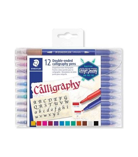 STAEDTLER® 3005 Doppelfasermaler Kalligraphie Ein Stift - zwei Spitzen für schmale und breite Linien Für ausdrucksstarke Schriften und dekorative Designs Linienbreiten ca. 3,5 mm und ca. 2,0 mm Lieferumfang: Etui mit 12 Doppelfasermalern Kalligraphie in sortierten Farben ...