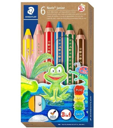 Noris® junior 140 3 in 1 Kindermalstift Der perfekte erste Kindermalstift für ungebremste Kreativität Allrounder 3 in 1: Bunt-, Wachsmal- und Aquarellstift in einem Leuchtende Farben für Papier, Karton, Glas und vieles mehr, sogar für dunkle Oberflächen Softer Abstrich in strahlenden Farben Das kompakte Format ist perfekt für kleine Kinderhände Extra bruchsicher durch die sehr dicke Mine Erhältlich in 20 Farben Einzelstift in bis zu 8 Farben Holz aus zertifizierten, nachhaltig bewirtschafteten Wäldern Dermatologisch getestet Lieferumfang: Kartonetui mit 6 Malstiften in sortierten Farben und 1 Spitzer ...