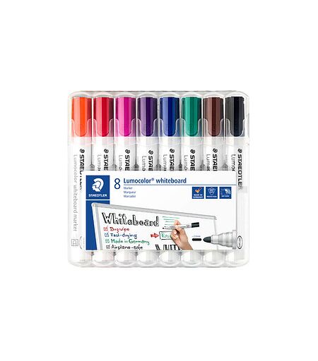 STAEDTLER Lumocolor Whiteboard-Marker farbsortiert 2,0 mm, 8 St. – perfekt geeignet für Ihre PräsentationenDie farbkräftige Tinte der STAEDTLER Lumocolor Whiteboard-Marker farbsortiert 2,0 mm, 8 St. bringt Workflows, Ideensammlungen oder Grafiken mit der gewünschten Wirkung auf Ihre Präsentationsflächen. Gestalten Sie Ihre Inhalte bei Schulungen, Meetings oder Workshops deutlich und informativ. Im Nachgang können Sie den Platz einfach wieder für das nächste Schaubild freimachen.Tolles Schreibgefühl, tolle FarbenFür Ihre Erklärungen stehen Ihnen mehrere Farben zur Wahl, sodass Sie immer die genau passende Farbe wählen können. Aus dieser Farbpalette können Sie sich bedienen: orange, rot, pik, lila, blau, grün, braun und schwarz. Auch längeres Schreiben und Malen ist sehr angenehm, da die Griffzone rund ist und dadurch eine flexible Handhaltung möglich wird.Klassisch runde SpitzeAusgestattet ist das Produkt mit robuster Rundspitze, die auch bei häufiger Nutzung lange durchhält. Folgende Strichstärke kann die Spitze erzeugen: 2,0 mm. Einfach, schnell und spurlos können Sie mit einem Tuch die Tinte wieder abwischen, ohne dass dabei Schlieren oder Verfärbungen zurückbleiben.GeruchsarmDank der geruchsarmen Tinte brauchen Sie keine Kopfschmerzen, Übelkeit oder Irritation der Atemwege zu befürchten. Diese werden meist durch stark riechende Lösungsmittel verursacht.In Nullkommanix trockenDank der schnell trocknenden Tinte passiert ein versehentliches Verschmieren nicht. Dies kommt besonders Linkshändern zugute.Nachfüllbar für eine längere NutzungHaben Sie ein Exemplar leer, können Sie dieses mit einer geeigneten Nachfülltinte wieder befüllen. Das ist ideal, wenn man der Umwelt zuliebe Müll vermeiden möchte. Im Vergleich ist das außerdem oft kostengünstiger als ein neues Produkt.Eintrocknen ist kein ThemaEs ist zum Glück völlig unproblematisch, den Marker einige Tage ohne Verschlusskappe liegen zu lassen. Auch dann ist die Farbe nicht eingetrocknet. Das Gehäuse aus robustem Kunststoff sorgt für eine zusätzliche Stabilität und Langlebigkeit bei der täglichen Anwendung.Klingt gut, richtig?Dieses Produkt ist perfekt geeignet für Whiteboards. Gut zu wissen: Es handelt sich hier um ein Produkt "Made in Germany", das eine hohe Qualität und lange Lebensdauer verspricht. Überzeugen Sie sich selbst von der Qualität und bestellen Sie die STAEDTLER Lumocolor Whiteboard-Marker farbsortiert 2,0 mm, 8 St. hier in unserem Online-Shop. ...