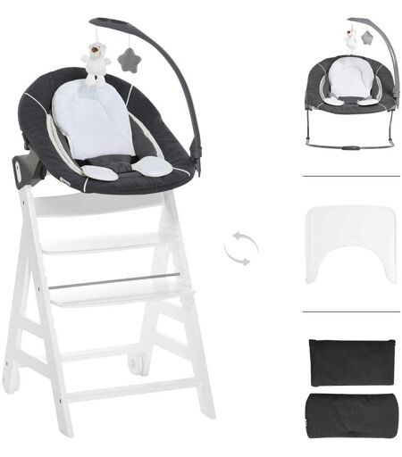 Der Treppenhochstuhl Beta+ von Hauck begleitet den Nachwuchs über viele Jahre. Das aus robuster Buche gefertigte Design ist bis zu 90 Kilogramm belastbar. In Kombination mit der auch separat verwendbaren Wippe Bouncer Deluxe kann er sogar ab der Geburt des Kindes genutzt werden. Treppenhochstuhl Beta+ Altersempfehlung: ab 6 Monaten bis ins Erwachsenenalter, belastbar bis 90 kg Material: massive Buche Verstellbarkeit: Sitz 5-fach und Trittbrett 3-fach verstellbar, Gurtsystem stufenlos verstellbar Sicherheit: Vorderbügel, Durchrutschschutz, 5-Punkt-Gurt Ausstattung: Essbrett, Vorderbügel, 5-Punkt-Gurt, 2-teilige Sitzauflage, Räder Lieferumfang: Hauck Treppenhochstuhl Beta+, Essbrett, Sicherehitsbügel, 5-Punkt-Gurt, Sitzauflage Charcoal Der Treppenhochstuhl Beta+ setzt auf Flexibilität: Die Sitzhöhe und die Höhe des Fußtrittes sowie deren Tiefe lassen sich durch ein Stecksystem bequem inidividuell anpassen. So genießen die Kids stets auf ihre Proportionen angepassten Sitzkomfort. Wahlweise ist die Nutzung alleinstehend im Zimmer mit Essbrett oder ohne direkt am Tisch möglich. Anstelle des Essbrettes ist der Hochstuhl mit dem Vorderbügel für eine optimale Sicherheit des Kindes nutzbar. Bei der Verwendung des Esstisches oder Vorderbügels bietet der montierte Schrittgurt Sicherheit gegen ein Durchrutschten des Kindes. Das 5-Punkt-Rückhaltesysstem ist einfach an der Rückenlehne mit einem Klettsystem zu befestigen und stufenlos an die Körpergröße des Kindes anzupassen. Die zweieilige Sitzauflage bietet dem Kind einen erhöhten Sitzkomfort. Der Hochstuhl ist absolut kippsicher und verfügt für ein leichtes Umstellen in der Wohnung über praktische Räder. Damit ist der Beta+ ein praktischer Mehrzweck-Hochstuhl, der für eine langjährige Nutzung ausgelegt ist. Wippe Bouncer Deluxe Melange Grey Altersempfehlung: ab Geburt bis max. 9 kg Material: Kunststoff, Metall, Textil Verstellbarkeit: einhändig verstellbare Rückenlehne mit Liegeposition Sicherheit: verstellbares 3-Punkt-Gurtsystem Ausstattung: herausnehmbarer Sitzverkleinerer, abnehmbares Untergestell, abnehmbares Mobile Lieferumfang: Wippe Bouncer Deluxe, Sitzverkleinerer, Mobile Mit der Wippe Bouncer Deluxe kannst Du Deinen Hauck-Hochstuhl Alpha+ bzw. Beta+ bereits ab der Geburt Deines Babys nutzen. In der ergonomisch geformten Schale liegt der Nachwuchs immer bequem. Der weich gepolsterte Sitzverkleinerer schmiegt sich angenehm an und stützt den Kinderkopf ab. Eine seitliche Polsterung garantiert zusätzlichen Halt. Für maximale Sicherheit ist der Alpha Bouncer mit einem 3-Punkt-Gurt ausgestattet. Die große Liegefläche kannst Du mit nur einer Hand mehrfach verstellen. So ist immer die richtige Position zum Füttern oder Spielen dabei. Auch eine Liegeposition ist möglich. Toll: Wenn Du den Hochstuhl samt Aufsatz an den Tisch stellst, kann Dein Baby von Anfang an am Familienleben teilhaben. Gleichzeitig schonst Du beim Füttern Deinen Rücken. Dein Baby hat Lust auf Abwechslung? Dann kannst... ...