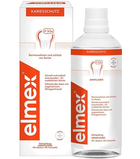 Anwendungsgebiet von Elmex Kariesschutz Zahnspülung, MundspülungElmex Kariesschutz Zahnspülung, Mundspülung ist die ideale Ergänzung der täglichen Zahnpflege. Sie bekämpft wirksam Karies verursachende Bakterien in der gesamten Mundhöhle, denn die Elmex Kariesschutz Zahnspülung, Mundspülung verteilt sich optimal bis tief in die Zahnzwischenräume. Somit ist sie besonders für Personen mit Teilprothesen, Brücken oder Zahnspangen geeignet. Elmex Kariesschutz Zahnspülung, Mundspülung ist ideal auch für unterwegs. Verwenden Sie sie immer dann, wenn sich keine Möglichkeit zum Zähneputzen bietet.Wirkungsweise von Elmex Kariesschutz Zahnspülung, MundspülungDas in der Elmex Kariesschutz Zahnspülung, Mundspülung enthaltene Aminfluorid schützt Ihre Zähne effektiv vor Karies und hemmt das Wachstum Karies verursachender Bakterien. Des Weiteren bildet die Elmex Kariesschutz Zahnspülung, Mundspülung einen Schutzfilm aus, der Ihre Zähne bei Säureangriffen vor Mineralverlust schützt und gleichzeitig den Einbau von Mineralien in den Zahnschmelz fördert. Ohne Farbstoffe und Alkohol ist die Elmex Kariesschutz Zahnspülung, Mundspülung eine hochwertige Ergänzung für den täglichen Kariesschutz.Wirkstoffe / Inhaltsstoffe / ZutatenInhaltsstoffe der Elmex Kariesschutz Zahnspülung, Mundspülung (nach INCI):