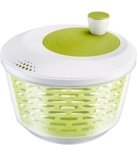 Mit der Salatschleuder "Spinderella" von Westmark trocknen Sie frisch gewaschenen Salat schnell und mühelos. Der praktische Küchenhelfer besteht aus einer transparenten Schüssel mit 4,4 Litern Fassungsvermögen, einem apfelgrünen Siebeinsatz und einem Deckel mit ergonomisch geformtem Drehknauf. Im Inneren des Deckels verbirgt sich die leichtgängige und zuverlässige Mechanik, die das Sieb beschleunigt und den Salat durch die Zentrifugalkraft von überschüssiger Feuchtigkeit befreit. Das Wasser sammelt sich beim Schleudern am Boden der äußeren Schüssel. Über den in dem Deckel integrierten Ausguss können Sie es einfach ausschütten, ohne dass es dabei erneut mit dem geschleuderten Salat in Kontakt kommt.Dank ihres transparenten Designs können Sie die große Kunststoffschüssel der "Spinderella" auch zum Servieren Ihrer Salatkreationen nutzen. Entnehmen Sie dazu einfach nach dem Schleudern den grünen Siebeinsatz und geben Sie den Salat direkt in die Schüssel. Jetzt nur noch das gewünschte Dressing und auf Wunsch weitere Zutaten hinzugeben, unterheben und fertig. Mit einem Durchmesser von 25 cm und einer Höhe von 18 cm eignet sich die Salatschüssel sowohl für Einzelpersonen als auch für Familien. Nach dem Gebrauch können Sie die aus gesundheitlich unbedenklichem Polypropylen (PP) hergestellte Salatschleuder zerlegen und entweder von Hand reinigen oder sie bequem in die Spülmaschine geben.Beim Design der Salatschleuder hat der aus dem sauerländischen Lennestadt stammenden Hersteller berücksichtigt, dass der Stauraum in vielen Küchen knapp ist. Aus diesem Grund hat er den nach oben gewölbten Deckel der "Spinderella" mit einer sogenannten Pass-Rille ausgestattet. Diese ermöglicht es, den Deckel nach dem Gebrauch einfach umgekehrt auf die Schüssel zu stecken. So haben Sie eine gerade Oberfläche und können die Salatschleuder platzsparend im Schrank verstauen.Die nur 432 Gramm schwere Salatschleuder "Spinderella" zeichnet sich durch ihre äußerst sorgfältige und robuste Verarbeitung aus, die dem Label "Made in Germany" alle Ehre macht. ...