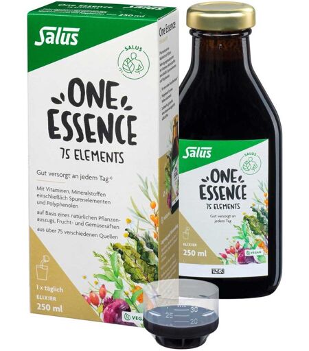 Anwendungsgebiet von One Essence 75 Elements Salus ElixierOne Essence 75 Elements Salus Elixier kombiniert die Vielfalt der Natur mit einer täglichen Multinährstoff-Versorgung, es emthält über 30 Kräuter und Früchte, mehr als 20 Obst- und Gemüsesorten, 10 Vitamine, 9 Spurenelemente und weitere natürliche Extrakte. Durch Polyphenole erhält das Elixier seine herbe Bitternote und ballaststoffreiche Akazienfasern runden die komplexe Rezeptur ab.
