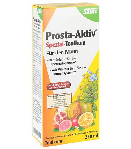 Anwendungsgebiet von Prosta Aktiv Spezial Tonikum SalusProsta Aktiv Spezial Tonikum Salus unterstützt die Prostatafunktion und die Spermienbildung.Wirkungsweise von Prosta Aktiv Spezial Tonikum SalusDie Prostata des Mannes produziert Samenflüssigkeit, die dem Transport der Spermien dient. Die Salus Originalrezeptur enthält wertvolle pflanzliche Inhaltsstoffe zur Stärkung der Prostata und des allgemeinen Wohlbefinden. Lycopinreicher Tomatenextrakt und Granatapfelsaft vesitzen aufgrund ihrer antioxidativen Eigenschaften eine krebshemmende Wirkung. Der Extrakt aus Kürbissamen und Brennesselblättern lindert Symptome einer gutartigen Prostatavergrößerung (BPH) wie nächtlicher Harndrang, Nachträufeln und Restharngefühl. Ebenfalls enthalten ist Selen, das die Spermienbildung unterstützt und für eine normale Beweglichkeit der Spermien sorgt. Vitamin D3 fördert das Immunsystem.Wirkstoffe / Inhaltsstoffe / ZutatenProsta Aktiv Spezial Tonikum Salus enthält: