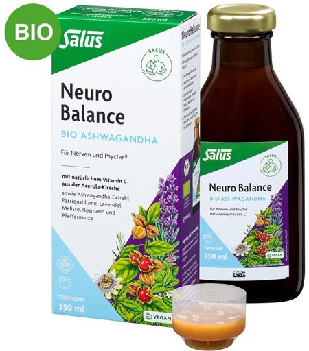 Anwendungsgebiet von Neuro Balance Bio Ashwagandha Tonikum SalusNeuro Balance Bio Ashwagandha Tonikum Salus bietet eine natürliche Unterstützung für Nerven und Psyche, dank des natürlichen Vitamin C aus Bio-Acerolakirschen. Dieses Vitamin ist entscheidend für die normale Funktion des Nervensystems und trägt dazu bei, Zellen vor oxidativem Stress zu schützen – eine wertvolle Hilfe für gestresste Nerven. Darüber hinaus liefert das Tonikum täglich 600 mg Ashwagandha-Extrakt und enthält weitere pflanzliche Inhaltsstoffe wie Passionsblume, Lavendel, Melisse, Rosmarin und Pfefferminze. Es ist vegan, vegetarisch, laktosefrei, glutenfrei und alkoholfrei sowie frei von Konservierungsstoffen. Es ist in Deutschland hergestellt und entspricht der laborgeprüften Qualität von Salus®.Wirkstoffe / Inhaltsstoffe / ZutatenZutaten von Neuro Balance Bio Ashwagandha Tonikum Salus:Wässriger Kräuterauszug* (37 %) (aus Melissenblättern*, Lavendelblüten*, Pfefferminzblättern*, Passionsblumenkraut*, Rosmarinblättern*), Wasser, Agavendicksaft*, Mangopüree*, Ananassaftkonzentrat*, Guavenpüree*, Orangensaftkonzentrat*, Acerolasaftkonzentrat* (4 %), Ashwagandhawurzelextrakt*, Passionsfruchtsaftkonzentrat*, Stabilisator Johannisbrotkernmehl*, Limetten-Aromaextrakt*.* aus ökologischem LandbauNährstoffe pro Tagesdosis 20 ml %*Vitamin C 80 mg 100 %Weitere Rezepturbestandteile pro Tagesdosis 20 mlAshwagandhawurzelextrakt 600 mg*% der Referenzmenge gem. EU-Verordnung 1169/2011GegenanzeigenBei bekannter Überempfindlichkeit gegenüber einem der oben genannten Inhaltsstoffe sollte das Produkt nicht verwendet werden.DosierungVerzehrempfehlung von Neuro Balance Bio Ashwagandha Tonikum Salus:2 x täglich 10 ml einnehmen.HinweiseDas Produkt ist nicht für Kinder, Schwangere und Stillende sowie Personen mit Lebererkrankungen geeignet. Die angegebene empfohlene tägliche Verzehrmenge darf nicht überschritten werden. Nahrungsergänzungsmittel sollten nicht als Ersatz für eine ausg ...