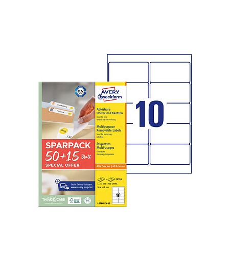 Die 650 AVERY Zweckform Etiketten weiß 96,0 x 50,8 mm lassen sich nach Ihren Wünschen einsetzenHier erfahren Sie mehr zu den 650 AVERY Zweckform Etiketten weiß 96,0 x 50,8 mm:Farbe: WeißMenge: 650 EtikettenBedruckbarAblösbarWelche Geräte eignen sich zum Bedrucken?Bedrucken können Sie die 650 AVERY Zweckform Etiketten weiß 96,0 x 50,8 mm mit Farb-Laser, InkJet, SW-Laser. Die Exemplare sind auf einem A4-Bogen angeordnet.Exemplare in WeißDas Design muss genauso passen wie die Funktionalität: Das klassische Design in Weiß eignet sich für viele verschiedene Verwendungszwecke. Hierdurch sind Sie völlig frei in der Gestaltung und können die Kennzeichnung ganz nach Ihren Bedürfnissen vornehmen.Kleben von alleinHier erhalten Sie ein Produkt aus Papier. Die 650 AVERY Zweckform Etiketten weiß 96,0 x 50,8 mm sind selbstklebend. Also einfach abziehen und wieder aufkleben. So einfach ist es! Ein Fehler beim Aufkleben passiert oder eine Etikettierung wird nicht mehr benötigt? Kein Problem dank einfacher Ablösung.Sie erhalten 650 EtikettenSie erhalten in dieser Packung 650 Etiketten. Das passende Format ist ein ausschlaggebendes Kaufkriterium und muss zu Ihrem Verwendungszweck passen. Die Maße betragen: 96,0 x 50,8 mm (BxH).Bereit für die perfekte Etikettenlösung?Bestellen Sie die 650 AVERY Zweckform Etiketten weiß 96,0 x 50,8 mm ganz unkompliziert hier im Shop und lassen Sie sich überzeugen! ...