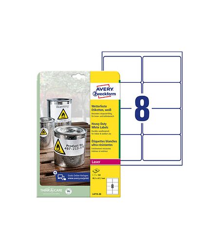 Mit den 160 AVERY Zweckform wetterfesten Folienetiketten L4715-20 weiß 99,1 x 67,7 mm kann die Etikettierung beginnenDie 160 AVERY Zweckform wetterfesten Folienetiketten L4715-20 weiß 99,1 x 67,7 mm sind wasserfest und können daher auch beruhigt auch im Freien oder in feuchten Räumen verwendet werden.Exemplare in WeißMachen Sie den Design-Check: Die weiße Farbe eignet sich hervorragend für eine neutrale Etikettierung. Das neutrale Erscheinungsbild wirkt immer professionell und kann somit für die unterschiedlichsten Zwecke genutzt werden. Die Umrandung fördert eine bessere Handhabung und Positionierung. Mit klaren Linien und Strukturen verleiht die rechteckige Form Ihren Inhalten eine präzise Darstellung. Für eine besonders formschöne Beschriftung sind außerdem die Ecken abgerundet.160 Etiketten in dieser PackungInsgesamt erhalten Sie 160 Etiketten in den Maßen 99,1 x 67,7 mm (BxH). Diese befinden sich auf 8 Stück je Blatt.Können problemlos bedruckt werdenDie 160 AVERY Zweckform wetterfesten Folienetiketten L4715-20 weiß 99,1 x 67,7 mm lassen sich mit Kopierer, Laser bedrucken. Die Exemplare sind auf einem A4-Bogen angeordnet.Werfen Sie einen Blick auf diese EigenschaftenAußerdem noch diese erwähnenswerten Features:Temperaturbeständigkeit -20 °C bis +80 °CLösungsmittelfreiDiese weiteren Eigenschaften können ebenfalls nur überzeugen: Um eine Verschmutzung müssen Sie sich keine Sorgen machen, bei Bedarf können Sie die Auszeichnungen einfach abwaschen und schon sind sie wieder sichtbar. Beim Abwaschen müssen Sie sich auch um das Wasser keine Gedanken machen, denn der Artikel ist wasserabweisend. Zudem ist er auch noch reißfest. Also wie Sie sehen, der kann einiges ab!Mit matter OberflächeHier erhalten Sie einen Artikel aus Polyester-Folie. Hier erhalten Sie ein mattes Produkt. Hierdurch spiegelt die Etikettierung nicht und ist unempfindlicher gegenüber unschönen Fingerabdrücken. Das Aufkleben ist jederzeit ohne weitere Utensilien möglich, die 160 AVERY Zweckform wetterfesten Folienetiketten L4715-20 weiß 99,1 x 67,7 mm sind nämlich selbstklebend.Ganz nach Ihrem Anwendungszweck gestaltbarDie Exemplare sind blanko und können somit individuell nach Ihren Bedürfnissen und nach Ihrem speziellen Verwendungszweck gestaltet werden.Was ist besonders an diesem Produkt?Sie suchen nach besonderen Eigenschaften? Das steckt in den 160 AVERY Zweckform wetterfesten Folienetiketten L4715-20 weiß 99,1 x 67,7 mm: Öl-, Schmutz abweisend.Verleihen Sie Ihren Produkten das gewisse Etwas!Sie können die 160 AVERY Zweckform wetterfesten Folienetiketten L4715-20 weiß 99,1 x 67,7 mm einfach in unserem Online-Shop bestellen.Nutzen Sie jetzt die kostenlose Online Software zum einfachen Gestalten & Bedrucken mit über 1.000 vorgestalteten Designs. ...