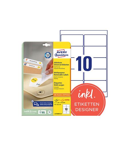 Drucken Sie Ihre Etiketten selbst – mit den 300 AVERY Zweckform Etiketten L4744REV-25 weiß 96,0 x 50,8 mmDie ersten Informationen zu den 300 AVERY Zweckform Etiketten L4744REV-25 weiß 96,0 x 50,8 mm erhalten Sie hier:Farbe: WeißMenge: 300 EtikettenBedruckbarAblösbarMit matter OberflächeHier entscheiden Sie sich für Exemplare aus Papier. Die matte Oberfläche ist ideal, um Informationen klar und gut lesbar zu präsentieren, ohne störende Lichtreflexionen. Die 300 AVERY Zweckform Etiketten L4744REV-25 weiß 96,0 x 50,8 mm sind selbstklebend. Einfach abnehmen und aufkleben. Die Ablösung funktioniert ganz unkompliziert und ist jederzeit möglich.Praktische AnordnungDie 300 AVERY Zweckform Etiketten L4744REV-25 weiß 96,0 x 50,8 mm sind optimal geeignet für Kopierer, SW-Laser, InkJet. Angeordnet sind die Exemplare auf einem A4-Bogen.Wie viele Exemplare erhalten Sie?Insgesamt erhalten Sie 300 Etiketten, welche auf 10 Stück je Blatt verteilt sind. Die Maße betragen: 96,0 x 50,8 mm (BxH).Exemplare in WeißMachen Sie den Design-Check: Das klassische Design in Weiß eignet sich für viele verschiedene Verwendungszwecke. Hierdurch sind Sie völlig frei in der Gestaltung und können die Kennzeichnung ganz nach Ihren Bedürfnissen vornehmen. Mit einem Rand versehen, erhalten Ihre Informationen eine professionelle Note.Zertifiziert und für gut befunden!Die 300 AVERY Zweckform Etiketten L4744REV-25 weiß 96,0 x 50,8 mm sind ausgezeichnet! Die relevanten Aspekte für eine Auszeichnung sind ein verantwortungsbewusster Umgang mit Ressourcen bei der Herstellung. Sie haben folgendes Zertifikat: FSC®: Dieses FSC®-zertifizierte Produkt enthält ausschließlich Materialien aus vorbildlich bewirtschafteten Wäldern und anderen kontrollierten Quellen. Der FSC® setzt sich weltweit für die Förderung guter Forstwirtschaft ein.Bereit für ein Etiketten-Upgrade?Bestellen Sie die 300 AVERY Zweckform Etiketten L4744REV-25 weiß 96,0 x 50,8 mm ganz einfach hier im Shop und lassen Sie sich überzeugen!Nutzen Sie jetzt die kostenlose Online Software zum einfachen Gestalten & Bedrucken mit über 1.000 vorgestalteten Designs. ...