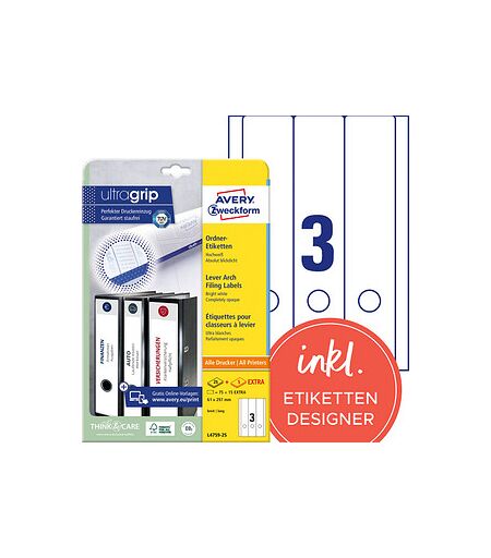 Legen Sie Ihre Dokumente farblich sortiert ad actaBedruckbare Ordneretiketten bieten Ihnen zahlreiche Möglichkeiten zum Organisieren und Beschriften Ihrer Akten. Die Ordneretiketten von AVERY Zweckform kommen vorgestanzt und mit der Option zum Bedrucken zu Ihnen. Egal ob im Büro, im Lager oder auch zu Hause – die Ordneretiketten sorgen für eine übersichtliche Kennzeichnung Ihrer Akten.Unkompliziert und sicher bedruckenDie praktische Anordnung der Ordneretiketten auf einem A4-Bogen ermöglicht ein unkompliziertes Bedrucken und Weiterverarbeiten. Zum Bedrucken eignet sich sowohl ein Laser- als auch ein InkJet-Drucker. Die Ordneretiketten sind leicht klebend und permanent haftend. Die einzigartige QCT-Kante schützt Ihren Drucker vor Klebstoffresten. Mit diesen Ordneretiketten sind Sie immer auf der sicheren Seite!Stets die richtigen Akten griffbereitDie selbstklebenden Ordneretiketten eignen sich optimal zur farblichen Kennzeichnung von beispielsweise Warengruppen oder Bereichen – Ihrer Fantasie sind keine Grenzen gesetzt. Für eine besonders formschöne Beschriftung sind die Ecken der Ordneretiketten abgerundet.Ordneretiketten-VorratEin A4-Bogen umfasst jeweils 3 Etiketten mit den Maßen 61,0 x 297,0 mm (BxH) für eine Rückenbreite von 7,0 - 8,0 cm. Eine Packung beinhaltet insgesamt 90 Etiketten verteilt auf 30 Blatt.Bestellen Sie die weißen AVERY Zweckform Ordneretiketten jetzt hier im Online-Shop!Nutzen Sie jetzt die kostenlose Online Software zum einfachen Gestalten & Bedrucken mit über 1.000 vorgestalteten Designs. ...