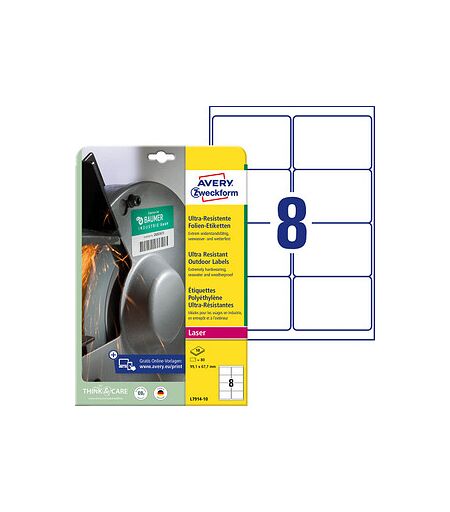 Die 80 AVERY Zweckform resistenten Folienetiketten L7914-10 weiß 99,1 x 67,7 mm können Sie selbst bedrucken und individuell einsetzenDie 80 AVERY Zweckform resistenten Folienetiketten L7914-10 weiß 99,1 x 67,7 mm können Sie hervorragend für Anwendungen benutzen, bei denen eine hohe Resistenz gefordert ist.Besteht aus Polyethylen-FolieHier erhalten Sie ein Produkt aus Polyethylen-Folie. Die matte Oberfläche sorgt für ein angenehmes, nicht spiegelndes Finish, das Ihre Produkte stilvoll präsentiert. Die 80 AVERY Zweckform resistenten Folienetiketten L7914-10 weiß 99,1 x 67,7 mm sind selbstklebend. Somit gelingt das Anbringen problemlos und ohne zusätzlichen Klebstoff.Eigenschaften, die überzeugenDamit noch immer nicht genug, denn auch über diese Features verfügt der Artikel:Temperaturbeständigkeit -40 °C bis +150 °CLösungsmittelfreiDamit nicht genug, es gibt noch weitere tolle Eigenschaften:WasserabweisendAbwaschbarReißfestEinfaches und schnelles DruckenMöchten Sie Ihre Exemplare selbst bedrucken? Das ist problemlos möglich. Nutzen Sie hierfür folgende Geräte: Kopierer, SW-Laser. Die Exemplare sind auf einem A4-Bogen angeordnet.Kann nach Ihrem Verwendungszweck gestaltet werdenFür eine Kennzeichnung gibt es viele verschiedene Gründe und auch verschiedene Anwendungsmöglichkeiten. Damit Sie die Exemplare so gestalten können, wie Sie es benötigen, erhalten Sie diese in blanko.Rechteckige FormAuch die Farbe und Form ist bei der Auswahl des perfekten Produkts relevant: Die weiße Farbe ist besonders praktisch, wenn Sie völlig frei in der Gestaltung sein wollen. Neutral und somit für alle Ihre Anwendungen optimal geeignet. Die Umrandung dient nicht nur der Ästhetik, sondern auch der leichteren Positionierung auf Verpackungen und Dokumenten. Diesen Artikel erhalten Sie in rechteckiger Form. Dank abgerundeter Ecken wirkt das Gesamtbild zudem weicher.80 Etiketten in den Maßen 99,1 x 67,7 mm (BxH)Insgesamt erhalten Sie 80 Etiketten, auf jedem Blatt 8 Stück. 99,1 x 67,7 mm (BxH) betragen die Maße.Geben Sie Ihren Produkten eine Identität!Bestellen können Sie die 80 AVERY Zweckform resistenten Folienetiketten L7914-10 weiß 99,1 x 67,7 mm ganz bequem hier bei uns im Online-Shop!Nutzen Sie jetzt die kostenlose Online Software zum einfachen Gestalten & Bedrucken mit über 1.000 vorgestalteten Designs. ...