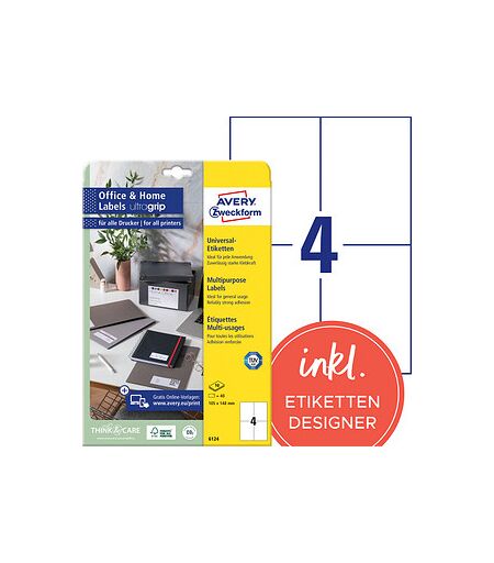 Die 40 AVERY Zweckform Etiketten 6124 weiß 105,0 x 148,0 mm sind praktisch und flexibel einsetzbarErste Informationen zu den 40 AVERY Zweckform Etiketten 6124 weiß 105,0 x 148,0 mm erhalten Sie hier:Farbe: WeißMenge: 40 EtikettenBedruckbarMit AbziehhilfeExemplare in WeißDas Design muss genauso passen wie die Funktionalität: Die Farbe der Exemplare ist weiß. Daher haben Sie viel Gestaltungsspielraum bei Ihren Kennzeichnungen. Das neutrale Erscheinungsbild eignet sich für die unterschiedlichsten Einsatzzwecke.Anzahl und Format der 40 AVERY Zweckform Etiketten 6124 weiß 105,0 x 148,0 mmEine Packung beinhaltet insgesamt 40 Etiketten, welche auf 4 Stück je Blatt verteilt sind. Damit das Produkt auch für Ihren Verwendungszweck geeignet ist, spielt das Format eine große Rolle. Die Maße betragen: 105,0 x 148,0 mm (BxH).Bedruckbar mit Kopierer, SW-Laser, InkJetBedrucken können Sie die 40 AVERY Zweckform Etiketten 6124 weiß 105,0 x 148,0 mm mit Kopierer, SW-Laser, InkJet. Das Bedrucken ist kinderleicht und funktioniert dank der Anordnung auf einem A4-Bogen problemlos und schnell.Einfacher Druck von PortoEine tolle Möglichkeit ist auch der Druck von Internetmarken. Einfach und unkompliziert Ihr gewünschtes Porto ausdrucken und aufkleben.Spart Zeit und Nerven: die AbziehhilfeHier erhalten Sie Exemplare aus Papier. Hier erhalten Sie ein mattes Produkt. Hierdurch spiegelt die Etikettierung nicht und ist unempfindlicher gegenüber unschönen Fingerabdrücken. Dank Abziehhilfe müssen Sie sich nicht länger mit schwer abzuziehenden Exemplaren herumschlagen. Die einzelnen Aufkleber können spielend leicht vom Druckbogen entfernt werden. So sparen Sie Zeit und Nerven. Darüber hinaus sind sie selbstklebend, einfach abnehmen und aufkleben.Mit Umwelt-Zertifikat!Die Entscheidung für ein Produkt wie dieses, das eine Zertifizierung besitzt, bietet Ihnen als Verbraucher die Möglichkeit, einen verantwortungsvollen Umgang mit Ressourcen zu unterstützen. Sie erhalten ein Produkt mit folgendem Zertifikat: FSC®-zertifiziert: FSC® steht für "Forest Stewardship Council" und wurde zur Agenda 21 der Weltkonferenz für Umwelt und Entwicklung 1992 gegründet. Er tritt für eine Verbesserung der weltweiten Waldbewirtschaftung ein. Hierfür sind umfangreiche Standards und ein einheitliches Zertifizierungssystem mit eigenem Warenzeichen entwickelt worden, dem sogenannten FSC®-Label.Geben Sie Ihren Produkten eine Identität!Bestellen können Sie die 40 AVERY Zweckform Etiketten 6124 weiß 105,0 x 148,0 mm ganz einfach hier bei uns im Online-Shop!Nutzen Sie jetzt die kostenlose Online Software zum einfachen Gestalten & Bedrucken mit über 1.000 vorgestalteten Designs. ...