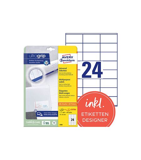 Erstellen Sie Ihre Etiketten einfach selbst – mit den 720 AVERY Zweckform Etiketten 3490 weiß 70,0 x 36,0 mmDie 720 AVERY Zweckform Etiketten 3490 weiß 70,0 x 36,0 mm sind vielseitige Werkzeuge, die in verschiedenen Branchen Anwendung finden. Ob für die Lagerhaltung, den Versand oder die Organisation im Büro – lernen Sie die vielfältigen Anwendungsmöglichkeiten kennen!Verfügt über eine matte OberflächeHier erhalten Sie ein Produkt aus Papier. Hier erhalten Sie ein mattes Produkt. Hierdurch spiegelt die Etikettierung nicht und ist unempfindlicher gegenüber unschönen Fingerabdrücken. Die 720 AVERY Zweckform Etiketten 3490 weiß 70,0 x 36,0 mm sind selbstklebend. Einfach abnehmen und aufkleben.Womit können die 720 AVERY Zweckform Etiketten 3490 weiß 70,0 x 36,0 mm bedruckt werden?Zum Bedrucken eignen sich folgende Geräte: Kopierer, SW-Laser, InkJet. Die praktische Anordnung auf einem A4-Bogen ermöglicht ein unkompliziertes Bedrucken und Weiterverarbeiten.Drucken Sie Ihr Porto einfach selbstNutzen Sie die 720 AVERY Zweckform Etiketten 3490 weiß 70,0 x 36,0 mm auch für den Druck von Internetmarken. Sie können ganz komfortabel Ihr Porto ausdrucken und auf Briefe, Päckchen oder Pakete aufkleben.720 Etiketten in den Maßen 70,0 x 36,0 mm (BxH)Sie erhalten in dieser Packung 720 Etiketten in den Maßen 70,0 x 36,0 mm (BxH). Verteilt sind sie auf 24 Stück je Blatt.Verfügt über einen Rand Kopf und FußDas Design muss genauso passen wie die Funktionalität: Die Farbe der Exemplare ist weiß. Daher haben Sie viel Gestaltungsspielraum bei Ihren Kennzeichnungen. Das neutrale Erscheinungsbild eignet sich für die unterschiedlichsten Einsatzzwecke. Mit einem Rand versehen, erhalten Ihre Informationen eine professionelle Note.Ein zertifiziertes ProduktDer grundsätzliche Faktor für eine Zertifizierung ist ein vorbildliches Herstellungsverfahren. Hier erhalten Sie ein Produkt mit folgendem Zertifikat: FSC®: Der Forest Stewardship Council® (FSC®) ist eine internationale Nicht-Regierungsorganisation, die weltweit eine vorbildliche und sozial gerechte Bewirtschaftung der Wälder fördert. Dieses Produkt besteht ausschließlich aus FSC®-zertifizierten und anderen kontrollierten Materialien.Die beste Etikettenlösung für Ihre Produkte!Bestellen Sie die 720 AVERY Zweckform Etiketten 3490 weiß 70,0 x 36,0 mm hier bei uns online!Nutzen Sie jetzt die kostenlose Online Software zum einfachen Gestalten & Bedrucken mit über 1.000 vorgestalteten Designs. ...