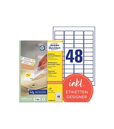 Universell einsetzbar – die 4.800 AVERY Zweckform Etiketten L4736REV-100 weiß 45,7 x 21,2 mmDie ersten Informationen zu den 4.800 AVERY Zweckform Etiketten L4736REV-100 weiß 45,7 x 21,2 mm erhalten Sie hier:Farbe: WeißMenge: 4800 EtikettenBedruckbarAblösbarEinfaches und schnelles Drucken dank praktischer AnordnungDer Artikel kann mit Kopierer, SW-Laser, InkJet bedruckt werden. Ein schnelles und einfaches Bedrucken ermöglicht die Anordnung auf einem A4-Bogen.Exemplare in WeißDas Design muss genauso passen wie die Funktionalität: Das klassische Design in Weiß eignet sich für viele verschiedene Verwendungszwecke. Hierdurch sind Sie völlig frei in der Gestaltung und können die Kennzeichnung ganz nach Ihren Bedürfnissen vornehmen. Mit einem sorgfältig gestalteten Rand konzipiert, werden Ihre Botschaften in den Mittelpunkt gerückt.Besteht aus PapierHier entscheiden Sie sich für einen Artikel aus Papier. Die matte Oberfläche verfügt über eine geringe Reflektion. Die Unempfindlichkeit gegenüber Fingerabdrücken und die Robustheit hierdurch ist ideal, wenn die Unterlagen durch viele Hände gehen. Die 4.800 AVERY Zweckform Etiketten L4736REV-100 weiß 45,7 x 21,2 mm sind selbstklebend. Somit gelingt das Anbringen problemlos und ohne zusätzlichen Klebstoff. Haben die 4.800 AVERY Zweckform Etiketten L4736REV-100 weiß 45,7 x 21,2 mm ihren Dienst getan, können sie ganz einfach wieder abgelöst werden.Zertifiziert und für gut befunden!Ein vorbildlicher Umgang mit Ressourcen im Rahmen der Produktherstellung ist das ausschlaggebende Kriterium für folgende Zertifizierung: FSC®: Dieses FSC®-zertifizierte Produkt enthält ausschließlich Materialien aus vorbildlich bewirtschafteten Wäldern und anderen kontrollierten Quellen. Der FSC® setzt sich weltweit für die Förderung guter Forstwirtschaft ein.Sie erhalten 4800 EtikettenSie erhalten in dieser Packung 4800 Etiketten in den Maßen 45,7 x 21,2 mm (BxH). Diese befinden sich auf 48 Stück je Blatt.Geben Sie Ihren Produkten eine Identität!Bestellen Sie die 4.800 AVERY Zweckform Etiketten L4736REV-100 weiß 45,7 x 21,2 mm einfach hier in unserem Online-Shop!Nutzen Sie jetzt die kostenlose Online Software zum einfachen Gestalten & Bedrucken mit über 1.000 vorgestalteten Designs. ...