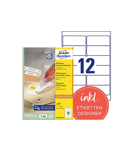 Für Ihre Etikettierung – die 1.200 AVERY Zweckform Etiketten L4743REV-100 weiß 99,1 x 42,3 mmDie 1.200 AVERY Zweckform Etiketten L4743REV-100 weiß 99,1 x 42,3 mm sind vielseitige Werkzeuge, die in verschiedenen Branchen Anwendung finden. Ob für die Lagerhaltung, den Versand oder die Organisation im Büro – lernen Sie die vielfältigen Anwendungsmöglichkeiten kennen!Verfügt über eine matte OberflächeHier entscheiden Sie sich für Exemplare aus Papier. Hier erhalten Sie ein mattes Produkt. Hierdurch spiegelt die Etikettierung nicht und ist unempfindlicher gegenüber unschönen Fingerabdrücken. Das Aufkleben ist jederzeit ohne weitere Utensilien möglich, die 1.200 AVERY Zweckform Etiketten L4743REV-100 weiß 99,1 x 42,3 mm sind nämlich selbstklebend. Haben die 1.200 AVERY Zweckform Etiketten L4743REV-100 weiß 99,1 x 42,3 mm ihren Dienst getan, können sie ganz einfach wieder abgelöst werden.Einfaches und schnelles DruckenFür eine schöne und individuelle Gestaltung können Sie die Exemplare bedrucken. Hierfür können Sie folgende Geräte: Kopierer, SW-Laser, InkJet nutzen. Dank der Anordnung auf einem A4-Bogen fällt das Bedrucken kinderleicht und funktioniert problemlos und schnell.Sie benötigen Nachschub?Insgesamt erhalten Sie 1200 Etiketten in den Maßen 99,1 x 42,3 mm (BxH). Auf jedem Blatt befinden sich 12 Stück.Ausgestattet mit Rand Kopf und FußDas Design muss genauso passen wie die Funktionalität: Die weiße Farbe ist besonders praktisch, wenn Sie völlig frei in der Gestaltung sein wollen. Neutral und somit für alle Ihre Anwendungen optimal geeignet. Auch bei einer mehrfachen Etikettierung ist danke der Umrandung für eine gute Übersichtlichkeit und Struktur gesorgt.Welche Umweltkriterien wurden bei der Herstellung berücksichtigt?Die Entscheidung für ein Produkt wie dieses, das eine Zertifizierung besitzt, bietet Ihnen als Verbraucher die Möglichkeit, einen verantwortungsvollen Umgang mit Ressourcen zu unterstützen. Sie erhalten ein Produkt mit folgendem Zertifikat: FSC®: Die für dieses Produkt verwendeten Materialien stammen aus Wäldern, deren Bewirtschaftung nach den Standards des Forest Stewardship Council (FSC®) erfolgt, sowie aus anderen kontrollierten Quellen.Ihre Produkte verdienen die beste Etikettenlösung!Bestellen Sie die 1.200 AVERY Zweckform Etiketten L4743REV-100 weiß 99,1 x 42,3 mm doch direkt hier bei uns im Online-Shop!Nutzen Sie jetzt die kostenlose Online Software zum einfachen Gestalten & Bedrucken mit über 1.000 vorgestalteten Designs. ...