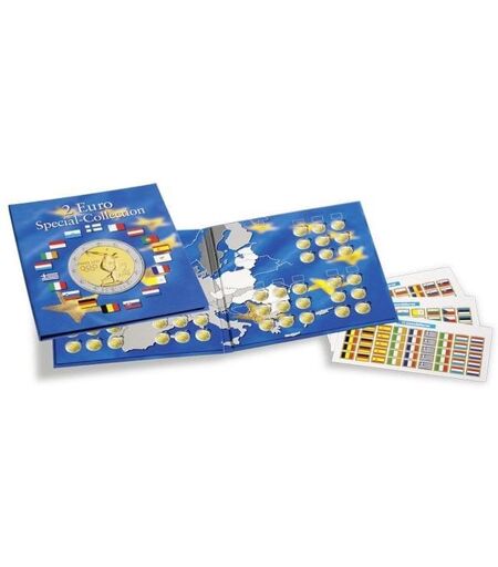 Broschiertes Buch Sammelalbum aus hochwertig bedrucktem stabilen Karton, mit Ausstanzungen zum Eindrücken von insgesamt 57 2-Euro-Münzen, inkl. Stickerset mit Flaggen (mehrfach) aller Euro-Länder zur individuellen Kennzeichnung der 2-Euro-Münzen. ...