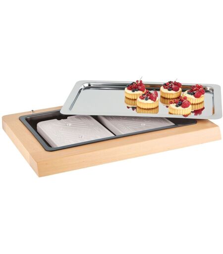 Set bestehend aus: - Box aus Buchenholz mit Kunststoffwanne (PC) - GN 1/1 Tablett aus 18/10 Edelstahl - 2 Kühlakkus ...
