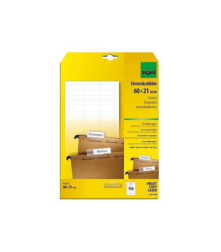 Für mehr Übersicht in der Hängeregistratur: die SIGEL Beschriftungsschilder für HängeregisterBeschriften Sie dieses Einsteckschildchen und stecken Sie es in den Reiter Ihrer LEITZ Hängeregistraturen. Schon wissen Sie auf einen Blick, was diese Mappe enthält. Die Beschriftungsschilder mit den Maßen 6,0 x 2,1 cm (BxH) sind aus festem weißen Karton gefertigt und mit beschreibbar. Die Größe ist für die 1-zeilige Beschriftung geeignet.Bedruckbar und auf DIN-A4-Bögen angeordnetDie 156 Beschriftungsschilder für Hängeregister sind auf 4 DIN-A4-Bögen angeordnet. Dadurch lassen sie sich einfach in den Drucker einlegen und bedrucken. Danach einfach die einzelnen Schildchen sauber abtrennen und in den Reiter Ihrer LEITZ Hängeregistratur einlegen.Nutzen Sie die preiswerte Art, Ihre Hängeregistratur zu strukturieren und freuen Sie sich über die unkomplizierte Bestellung und unsere schnelle Lieferzeit. ...