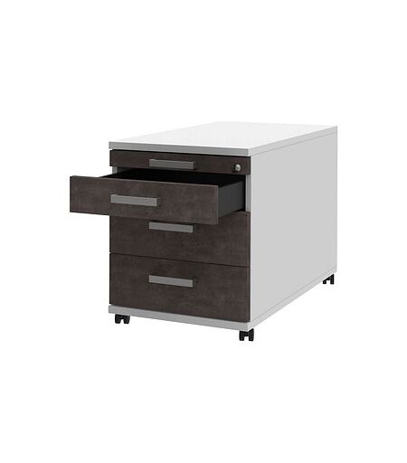 röhr Imperia Rollcontainer weiß, quarzit 4 Auszüge 42,7 x 80,0 x 54,4 cm: Ihre Unterlagen übersichtlich verwahrtDer röhr Imperia Rollcontainer weiß, quarzit 4 Auszüge 42,7 x 80,0 x 54,4 cm ist mit seinen leichtgängigen Rollen äußerst mobil und flexibel. Er bietet genug Stauraum für alle Ihre wichtigen Büro-Utensilien und Dokumente. Positionieren Sie ihn einfach dort, wo es für Sie besonders geschickt ist und bringen Sie darin alles unter, was Sie immer schnell zur Hand haben müssen.Beste SchubladenausstattungFolgende Aufteilung bietet das Modell: 4 Auszüge, das heißt 1 Utensilienauszug und 3 Schubladen. So haben Sie genügend Stauraum für Ihre Ihre Geschäftsunterlagen. Hier handelt es sich um Schubladen aus Stahl. Die einzelnen Schubladen können Sie bequem bis zu 75% aufziehen. Die Auszugssperre vermeidet das gleichzeitige Öffnen mehrerer Schübe sowie das komplette Herausziehen der einzelnen Schübe. So wird die Kippgefahr des Möbelobjekts und das Herausfallen der Schubladen unterbunden.Interessantes zu Material und BauweiseHier erfahren Sie wichtige Informationen zur Machart: Holz, aus dem der Korpus angefertigt ist, hat eine lange Lebensdauer und besondere Robustheit. So haben Sie lange Freude an diesem Produkt. Die Melaminharzbeschichtung macht dieses Möbelobjekt unempfindlich gegen Stöße, Hitze und Feuchtigkeit und ist zudem pflegeleicht. Die Optik gefällt durch stylische Farbkonstraste.Die Farbe des Korpus ist weiß, die Schubladen besitzen die Farbe quarzit. Die Plattenkantenfarbe ist weiß.So sehen die Griffe ausDas Öffnen und Schließen funktioniert bequem dank der praktischen Relinggriffe. Die Griffe sind aus strapazierfähigem Metall.Schließen Sie ab!Damit nicht jeder einen Einblick hat, ist dieses Exemplar zentral abschließbar. Diese Ausstattungsmerkmale hat das Möbelelement zudem: mit Einschubdämpfung.Hier weitere zu beachtende FaktenFür eine gute Verarbeitung und Haltbarkeit spricht außerdem, dass es sich um ein Produkt "Made in Germany" handelt. Das vollständige Gewicht des Möbelstücks beträgt 36,0 kg. Werfen Sie einen Blick auf folgende Maße: Breite: 42,7 cmTiefe: 80,0 cmHöhe: 54,4 cmWeitere Einrichtungsmöglichkeiten gewünscht?Gestalten Sie Ihr Wohlfühlbüro aus weiteren Möbelelementen aus dieser Möbelserie namens Imperia. Ob im Großraumbüro oder im Home-Office – in einem schönen Ambiente mit modernem Büromöbel macht das Arbeiten gleich mehr Spaß.Passt dieses flexible Büromöbelelement zu Ihrem Arbeitsplatz?Freuen Sie sich auf den röhr Imperia Rollcontainer weiß, quarzit 4 Auszüge 42,7 x 80,0 x 54,4 cm und bestellen Sie ihn gleich in unserem Online-Shop. ...