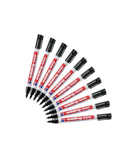 Dauerhaft lesbar beschriften – edding 400 Permanentmarker schwarz 1,0 mm, 10 St.Die edding 400 Permanentmarker schwarz 1,0 mm, 10 St. bieten einen satten Farbauftrag sowohl auf glatten als auch rauen Untergründe und sind somit vielseitig verwendbar. Mit diesem beliebten Produkt können Sie fast alle Materialien dauerhaft beschriften.Wasserfest und permanentDa die Tinte wasserfest ist, können Sie mit den Markern auch Oberflächen beschreiben, die Feuchtigkeit ausgesetzt sind, ohne dass die Farbe verwischt oder entfernt werden kann.Verblasst nichtDie Tinte ist lichtbeständig und garantiert eine dauerhafte Farbkraft.Augenblicklich trockenEin weiteres Plus: Die Farbe trocknet sehr schnell und verschmiert dadurch nicht so leicht. Dies ist besonders vorteilhaft für Linkshänder.Einfach nachfüllen und weiter geht's!Sehr praktisch: Die Tinte ist nachfüllbar. Das ist perfekt für alle, die aus Umweltschutzgründen Abfall reduzieren möchten. Im Vergleich ist das außerdem oft kostengünstiger als ein neues Produkt.Gut für empfindliche NasenGut zu wissen: Der Stift sondert keinen unangenehmen Geruch ab, so wie es bei manchen Exemplaren der Fall ist – die enthaltene Tinte ist geruchsarm. Perfekt geeignet ist das Produkt für fast alle Materialien wie Holz, Metall, Glas, Plastik oder Karton.Überzeugt mit FarbeMit der Farbe Schwarz werden Ihre Projekte sehr gut zur Geltung kommen. Das Modell bietet ein gutes Gefühl beim Schreiben und Malen, denn durch die runde Griffzone liegt es gut in der Hand.Welche Spitze hat der Artikel?Die klassische runde Spitze ist robust und sorgt für ein angenehmes Schreibgefühl. Folgende Strichstärke kann die Spitze erzeugen: 1,0 mm. Im Falle einer verschlissenen Schreibspitze ist ein Austausch möglich. Sie können Ersatzspitzen einfach und bequem nachbestellen.Für Ergebnisse, die bleibenFür eine gute Verarbeitung und Haltbarkeit spricht, dass es sich hier um ein Produkt "Made in Germany" handelt. Bestellen können Sie die edding 400 Permanentmarker schwarz 1,0 mm, 10 St. bequem hier bei uns online. ...