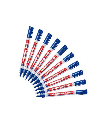 Für verlässliche Beschriftungen: edding 400 Permanentmarker blau 1,0 mm, 10 St.Beschriften Sie ohne Kompromisse mit den edding 400 Permanentmarkern blau 1,0 mm, 10 St. Die beständige und permanente Tinte macht dieses Produkt in allen Bereichen unersetzlich. Sei es im Lager, im Büro, in der Schule oder in der Küche – Sie werden begeistert sein!Permanent und wasserfestJe nach Einsatzbereich sind unterschiedliche Eigenschaften gefragt. Bei Markern wie diesen unterscheidet man zwischen "permanent" und "non-permanent", das heißt, ob sich die Farbe wieder wegwischen lässt. Das vorliegende Exemplar ist permanent und wasserfest. Deshalb können Sie Geschriebenes nicht mehr korrigieren bzw. abwischen und es bleibt Ihnen dauerhaft und gut lesbar erhalten.LichtbeständigDie Tinte ist lichtbeständig, sodass Sie auch nach längerer Zeit nicht die Farbintensität verliert.In Nullkommanix trockenDie Tinte ist so beschaffen, dass sie nicht so schnell verschmiert und schnell trocknet. Für Linkshänder ist dies besonders nützlich.Einfach nachfüllen und weiter geht's!Sehr praktisch: Die Tinte ist nachfüllbar. Das ist perfekt für alle, die aus Umweltschutzgründen Müll reduzieren möchten. Im Vergleich ist das außerdem oft kostengünstiger als ein neues Produkt.Geruchsarme TinteDie geruchsarme Tinte ermöglicht eine angenehme Nutzung auch über einen längeren Zeitraum hinweg. Ideal geeignet ist das Produkt für fast alle Materialien wie Holz, Metall, Glas, Plastik oder Karton.Markante Farbe und guter GriffDie Farbe Blau sorgt dafür, dass Ihre Arbeiten besonders gut ins Auge fallen. Dank runder Griffzone passen die edding Permanentmarker 400 zu jedem Schreibtyp und liegen sehr angenehm in Ihrer Hand.Wie breit ist der erzeugte Strich?Die klassische runde Spitze ist robust und sorgt für ein angenehmes Schreibgefühl. Die Spitze kann einen Strich in folgender Stärke erzeugen: 1,0 mm. Falls die Spitze einmal Schaden nimmt, kann sie ausgetauscht werden. Sie können Ersatzspitzen jederzeit nachbestellen.Dieses Produkt kann jeder gut gebrauchen!Es handelt sich hier um ein Produkt "Made in Germany", was für eine hohe Qualität spricht. Überzeugen Sie sich von der hohen Qualität und bestellen Sie die edding 400 Permanentmarker blau 1,0 mm, 10 St. komfortabel hier im Online-Shop. ...