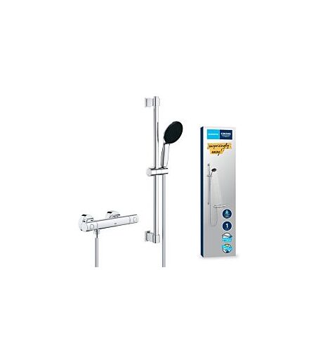 Grohe Precision Get Duschthermostat 34856000Heben Sie Ihre tägliche Duschroutine mit den Sicherheitsfunktionen und der nachhaltigen Technologie der GROHE Precision Get Brausegarnitur mit Thermostat auf ein neues Niveaumit Brausestangenset 1 Strahlart (Rain)bestehend aus:Precision Get Thermostat-Brausebatterie 1/2" (34 773)Vitalio Start 110 Brausestangenset, 600 mm (27 942)geeignet zum Bohren (Schrauben und Dübel beiliegend) oder Kleben (GROHE QuickGlue S 41 247 000 seperat erhältlich - 2 x erforderlich)Belastbarkeit der Brausestange: max. 20 kgDie angegebene Gewichtskraft gilt für eine statische (langsam aufgebrachte) Belastung und bestimmungsgemäßen GebrauchGROHE QuickSpanner beiliegend ...