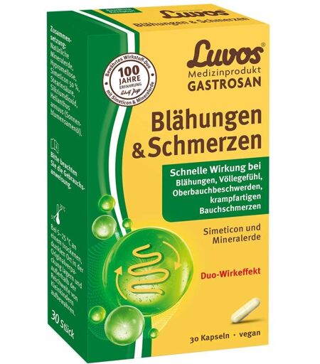 Anwendungsgebiet von Luvos® Gastrosan Blähungen & Schmerzen KapselnWofür werden Luvos® Gastrosan Blähungen & Schmerzen Kapseln angewendet?Luvos® Gastrosan Blähungen & Schmerzen Kapseln ist ein Medizinprodukt, das verwendet wird zur symptomatischen Behandlung von Bauchschmerzen und -beschwerden, Druckgefühl im Bauchraum, Aufstoßen und Blähungen bei Erwachsenen und Kindern ab 12 Jahren.Obwohl Gasbildung und Blähungen ein häufiges Problem sind, können sie peinlich, schmerzhaft und unangenehm sein. Luvos® Gastrosan Blähungen & Schmerzen Kapseln enthält den Duo-Wirkstoff: Simeticon und natürliche Mineralerde. Diese Stoffe werden vom Darm nicht aufgenommen.Simeticon ist ein bewährter Wirkstoff mit schaumverhütender Wirkung. Es sorgt dafür, dass sich die Gasblasen im Magen und im Darm leichter verbinden, sodass die Gase leichter abfließen könnenNatürliche Mineralerde ist ein Bindungsmittel, das Giftstoffe, Bakterien sowie Viren adsorbiert und so verhindert, dass sie sich an den Darmschleimhäuten festsetzenBlähungen, Völlegefühl, krampfartige Bauchschmerzen und Oberbauchschmerzen werden schnell und zuverlässig gelindert. Der Magen-DarmTrakt wird entspannt und kommt zur Ruhe.Die Inhaltsstoffe von Luvos® Gastrosan Blähungen & Schmerzen Kapseln sind vegan, glutenfrei, laktosefrei und ohne künstliche Zusatzstoffe.Wirkstoffe / Inhaltsstoffe / ZutatenZutaten von Luvos® Gastrosan Blähungen & Schmerzen Kapseln:Natürliche Mineralerde, Hypromellose, Simeticon 50 %, Stearinsäure, Siliziumdioxid, Helianthus annuus (Sonnenblumensamenöl).GegenanzeigenBei bekannter Überempfindlichkeit gegenüber einen der oben genannten Inhaltsstoffe sollte dieses Produkt nicht angewendet werden.Kapseln nicht kauen oder zerbeißen - Die Kapseln dürfen sich nicht im Mund auflösen Kapseln sollten nicht gleichzeitig mit einem Arzneimittel oder Nahrungsergänzungsmittel eingenommen werdenAußerhalb der Reichweite von Kindern aufbewahrenNicht geeigne ...