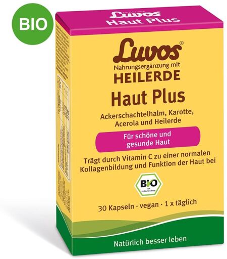 Anwendungsgebiet von Luvos Heilerde Bio Haut Plus KapselnLuvos Haut Plus ist ein optimal abgestimmter Bio-Komplex mit Heilerde und bio-zertifizierten pflanzlichen Zutaten. Das hochwertige Naturprodukt enthält neben Heilerde Bio-Ackerschachtelhalm mit einem hohen Silizium-Gehalt, Bio-Karotte und den Bio-Enhancer Piperin aus Schwarzem Pfeffer. Vitamin C, enthalten in der Bio-Acerola-Kirsche, trägt zur normalen Kollagenbildung für eine normale Funktion der Haut bei und schützt die Zellen vor oxidativem Stress. Dies unterstützt wirkungsvoll die Versorgung der Haut, was ihr eine natürliche, gesunde Ausstrahlung verleiht. Eine Kapsel täglich reicht aus.