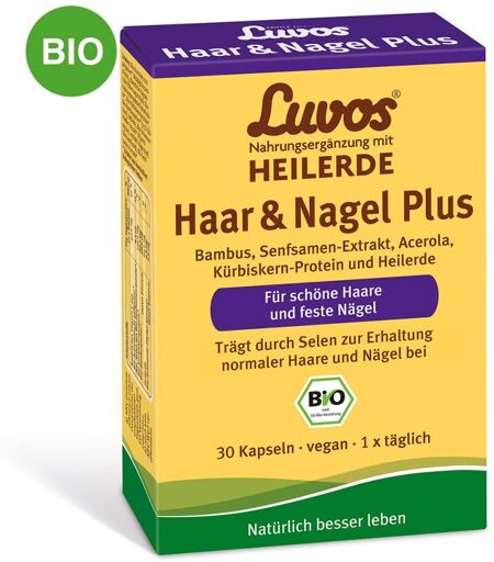 Anwendungsgebiet von Luvos Heilerde Bio Haar & Nagel Plus KapselnLuvos Haar & Nagel Plus ist ein optimal abgestimmter Bio-Komplex mit Heilerde und bio-zertifizierten pflanzlichen Zutaten. In dem hochwertigen Naturprodukt ist Heilerde mit bewährten pflanzlichen Naturstoffen kombiniert: mit siliziumreichem Bio-Bambus, Bio-Senfsamen-Extrakt, Bio-Kürbiskern-Protein und dem Bio-Enhancer Piperin aus Schwarzem Pfeffer. Enthält zudem Vitamin C aus der Acerola-Kirsche. Selen, aus dem Senfsamen-Extrakt, trägt zur Erhaltung normaler Haare und Nägel bei.