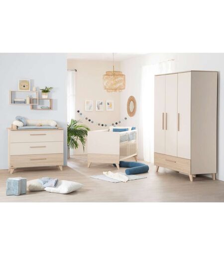 Das dreiteilige Babyzimmer Sidney von Roba besteht aus einem Babybett, einer Wickelkommode und einem dreitürigen Kleiderschrank. Es besticht in einer eleganten Optik. Cashmere- und eichenholzfarbene Partien verleihen den Möbelstücken eine harmonische Ausstrahlung. Massivholz-Details setzen Akzente. Babybett Sidney Lieferumfang: Babybett Sidney von Roba, 3-fach verstellbarer Lattenrost, 3 herausnehmbare Schlupfsprossen Material: Rahmen aus Spanplatte (melaminbeschichtet), Flachstäbe aus Schichtholz, Füße aus Massivholz, Lattenrost aus Schichtholz Verwendung: Babybett, umbaubar zum Juniorbett (Umbauseiten separat erhältlich) Belastbarkeit: bis 50 kg Maße: 143(L) x 76(B) x 82(H) cm, Liegefläche 140(L) x 70(B) cm Das Babybett Sidney von Roba lädt Dein Kleines zum Träumen auf der 140 mal 70 Zentimeter großen Liegefläche ein. Du kannst den Lattenrost für ein rückenschonendes Ablegen des Kindes in drei verschiedenen Höhen befestigen. Die praktischen Flachstäbe des Bettgitters halten Deinen Mini sicher auf der Matratze. Erst wenn Du die Schlupfsprossen des Designs entfernst, genießt Dein Kind die Freiheit, selbstständig ins Bett zu krabbeln oder wieder heraus. Praktisch: Separat erhältliche Umbauseiten bieten Dir die Möglichkeit, das Babybett in eine Juniorvariante zu verwandeln. Wickelkommode Sidney breit Material: Grundmaterial Spanplatte (melaminbeschichtet), Rückwand aus HDF, Griffe und Füße aus Massivholz Ausstattung: 3 Schubladen mit Vollauszug, abnehmbarer Wickelaufsatz Funktionen: abnehmbarer Wickelaufsatz Maße: 98(H) x 110(B) x 75(T) cm, ohne Wickelaufsatz 98(H) x 110(B) x 40(T) cm, Wickelhöhe 90,5 cm Auf der Wickelkommode Sidney kannst Du Deinem Mini entspannt die Windeln wechseln, ihn waschen oder anziehen. Der Wickelaufsatz befindet sich in einer rückenfreundlichen Höhe. Drei voll ausziehbare Schubladen bieten Dir ausreichend Platz für Pflegeprodukte und Wechselwäsche. Praktisch: Für eine lange Nutzungsdauer lässt sich der Aufsatz der Wickelkommode einfach abnehmen. Kleiderschrank Sidney 3-türig Material: Korpus Spanplatte (melaminbeschichtet), Rückwand aus HDF, Griffe und Füße aus Massivholz Ausstattung: 3 Türen, 1 breiter Einlegeboden, 1 Kleiderstange, 4 schmale Einlegeböden, 1 Schublade Funktionen: Türen mit Soft-Close-Funktion Maße: 190(H) x 118(B) x 52(T) cm Der Kleiderschrank Sidney macht es Dir leicht, Ordnung im Kinderzimmer zu halten. Hinter seinen drei sanft und leise schließenden Türen wartet jede Menge Stauraum. Neben einem breiten Einlegeboden und einer Kleiderstange stehen Dir drei schmale Einlegeböden und eine Schublade zur Verfügung. ...