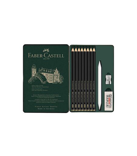 Mit den FABER-CASTELL Pitt Graphite Matt Graphitstiften HB, 2B, 4B, 6B, 8B, 10B, 12B, 14B schwarz mit Radierer, 1 Set gelingt Ihnen garantiert jede SkizzeSkizziere, Scribbeln, Zeichnen – Künstler schwören bei ihren grafischen und kreativen Arbeiten auf die FABER-CASTELL Pitt Graphite Matt Graphitstifte HB, 2B, 4B, 6B, 8B, 10B, 12B, 14B schwarz mit Radierer, 1 Set! Im Folgenden können Sie lesen, wofür das Produkt konzipiert wurde: monochrome Grafitarbeiten.Alles zur MinenhärteJe nachdem, wofür Sie einen Stift einsetzen möchten, eignen sich eher härtere bzw. eher weichere Minen. Wie praktisch, dass Sie mit diesem Pack gleich mehrere Minenhärten bekommen. Im Set enthalten sind folgende Minenausführungen: HB, 2B, 4B, 6B, 8B, 10B, 12B, 14B.Gute HandhabungDie Finger können die FABER-CASTELL Pitt Graphite Matt Graphitstifte HB, 2B, 4B, 6B, 8B, 10B, 12B, 14B schwarz mit Radierer, 1 Set locker und unverkrampft halten, da der Schaft eine ergonomische Sechskantform aufweist.Extrem hohe BruchfestigkeitDas Material der Mine ist Graphit. Es garantiert sehr gute Radiereigenschaften. Bei diesem Exemplar ist sie zudem äußerst bruchsicher und somit gegen schnelles Abbrechen geschützt.Mit RadiergummiSchreib- oder Zeichenfehler sind mit diesem Exemplar blitzschnell wieder entfernt, da der Radiergummi integriert ist. Dadurch können Sie Ihre Aufzeichnungen ganz schnell wieder verschwinden lassen und beliebig oft überschreiben.Klingt gut, richtig?8x Graphitstifte, Radiergummi, Spitzer, Estompe Papierwischer, Metall-Etui gibt es bei Kauf der FABER-CASTELL Pitt Graphite Matt Graphitstifte HB, 2B, 4B, 6B, 8B, 10B, 12B, 14B schwarz mit Radierer, 1 Set mit dazu. ...