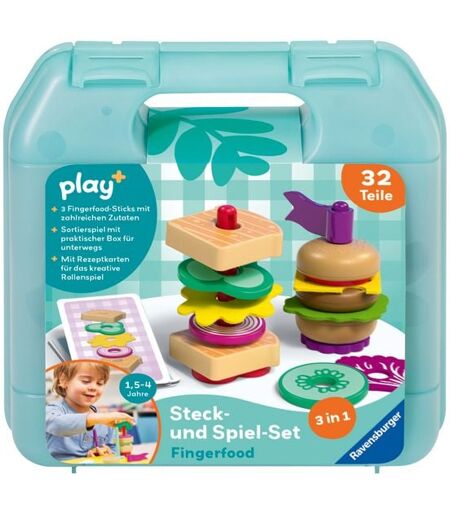 Erdbeere und Käse oder lieber Salat und Tomate? Dieses Steck-Set lädt zu kreativem Spielspaß ein! Mit den Zutaten aus verschiedenen Materialien stecken die Kleinen kinderleicht bunte Spieße – ob nach Rezeptkarten oder ganz frei. Ganz nebenbei fördert das Set Feinmotorik und Geschicklichkeit. Die praktische Lunchbox hilft beim Sortieren und Aufbewahren und ist ideal für unterwegs. Spielerisch lernen Kinder Farben, Materialien und Lebensmittel kennen und tauchen in fantasievolle Rollenspiele ein. Play+, die neue Baby- und Kleinkindlinie, fokussiert auf eine ganzheitliche frühkindliche Förderung – mit der gesamten Erfahrung der Marke Ravensburger.Die abwechslungsreichen Bücher und Spielzeuge von Play+ garantieren Kindern von 0-3 Jahren jede Menge Spaß und ermöglichen ein spielerisches Lernen und Entdecken – egal ob gemeinsam oder auch allein.Die Bedürfnisse der Kinder und die Anforderungen der Eltern bestimmen die Entwicklung aller Produkte. Der Blick fürs Detail, das besondere Extra und eine moderne Gestaltung machen das Programm von Play+ aus, immer unter Einhaltung der hohen Ravensburger Sicherheits- und Qualitätsansprüche. Denn sicher ist sicher. ...