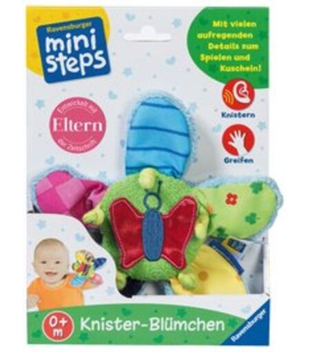 MINISTEPS Knister-Blümchen. Ein buntes Blümchen voller aufregender Details: die Blütenblätter faszinieren mit Knistergeräusch und Granulatfüllung, die Nuckelknoten laden ein zum In-den-Mund-Nehmen und in der Mitte sitzt ein wunderschöner Schmetterling mit glänzenden Flügeln. Das kuschelweiche Schmusetuch animiert so zum Erforschen mit allen Sinnen. Für Kinder ab 0 Monaten. ...