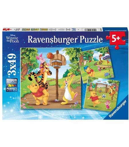Mit unserem Winnie Puuh Sportfest-Trio gibt es einen Punkt für Rätselspaß!Ob Pooh eine Golfkugel in einem Honigtopf versenkt, einen Fußball ins Tor schießt oder Piglet und Tigger beim Basketball hilft – im Hundred Acre Wood ist Spiel und Spaß angesagt! Unser alter, alberner Bär und seine Freunde treiben gesunde Bewegung und haben dabei jede Menge Spaß in unserem Puzzleset zum Thema Sport. Zusammen mit Ferkel, Tigger, Eule, Rabbit, Kanga, Roo und Puuh wird Ihr Kind ganz besonderen Rätselspaß erleben!Puzzles fördern durch wiederholtes Üben die Hand-Augen-Koordination, die Feinmotorik und die Problemlösungsfähigkeit und bieten dabei jede Menge Spaß! Unsere drei 49-teiligen Puzzles haben große, robuste Teile, die kleine Hände leicht greifen können, sodass wiederholter Spielspaß garantiert ist, und werden mit praktischen Bildanleitungen in voller Größe geliefert. Die sauber geschnittenen Teile und die präzise Passform von Ravensburger sorgen für ein angenehmes Puzzlevergnügen für Kinder und ihre erwachsenen Helfer. Unsere Kriterien für die perfekte Altersangabe garantieren, dass dieses Puzzle für Kinder ab 5 Jahren Spaß macht und lehrreich ist! ...