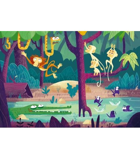 Wer hat Lust auf eine verrückte Dschungel-Safari? Es gibt die tollsten Tiere zu bestaunen! Eine freche Affenbande, ein faules Faultier und riesige Schlangen, lang wie Lianen! Doch Vorsicht! Im trüben Fluss lauert Gefahr! Und die hat viele spitze Zähne …Puzzle&Play; ist ein innovatives Konzept, das Puzzle- und Spielspaß clever und kinderleicht miteinander verbindet. Denn die fertigen Puzzles werden anschließend zur Spielkulisse! Mehrere spannende Erlebniswelten stehen dabei zur Auswahl: Piraten, Ritterburg und Tiere. Und so funktioniert’s: Jede Puzzle&Play-Box; enthält zwei Puzzles, die im Inneren der Kartonhälften gepuzzelt werden. Anschließend werden die Kartonhälften übereinandergestellt und mithilfe transparenter Clips verbunden. Fertig ist die Spielkulisse! Ein Booklet mit kurzer Story führt in die Geschichte ein und stellt die Charaktere vor, die als Spielfiguren in jeder Box enthalten sind. Der Clou: Jede Erlebniswelt kann mit weiteren Boxen nach Belieben ausgebaut werden! So entsteht nach und nach eine große, abenteuerliche Spielwelt, die die Fantasie beflügelt. ...