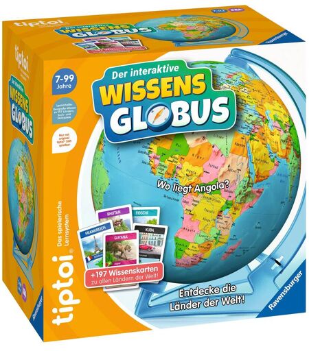 Der interaktive Wissens-Globus von Ravensburger aus der tiptoi-Reihe zeigt wissbegierigen Kids, wo Hauptstädte, Länder und berühmte Sehenswürdigkeiten liegen. Tippen, spielen und vergnügt lernen lautet hier die Devise. Der interaktive Wissens-Globus aus der tiptoi-Reihe von Ravensburger 1 Globus (2 Halbschalen), Durchmesser ca. 23 cm, 1 Drehständer, 200 Spielkarten Soundeffekte bei Verwendung des separat erhältlichen tiptoi-Stiftes deutschsprachig Kunststoff ab 7 Jahren Wo genau liegt eigentlich Deutschland? Wo Italien? Und wie heißt die Hauptstadt der USA? Mit dem Wissens-Globus aus der tiptoi-Reihe und zusätzlichen Länder-Spielkarten lernen Kinder 197 Länder der Erde kennen. Sie erfahren so Wissenswertes zu Ländern, Hauptstädten, Landschaften, Sehenswürdigkeiten und Sprachen. Bitte beachten: Das Spiel funktioniert nur in Kombination mit dem separat erhältlichen tiptoi-Stift. Tippen Kids mit ihm auf Bilder oder Texte der Karten, erklingen Geräusche, Sprachbeispiele und Musik wie Nationalhymnen. Zudem vertiefen kleine Entdecker in verschiedenen Such- und Quizspielen ihr erlerntes Wissen und lernen immer wieder Neues hinzu. Das Spiel trainiert das Gedächtnis und ermuntert Kids dazu, neue Städte, Länder und Regionen kennenzulernen und sich einzuprägen. Das Spiel mit Freunden oder Geschwistern verbessert die soziale Kompetenz. Die tiptoi-Reihe beinhaltet Bücher und Spiele mit wichtigen Lern- und Wissensthemen für Kinder von zwei bis sieben Jahren. Die zugehörigen Audiodateien kannst Du über den tiptoi-Manager oder die optional erhältliche Ladestation laden. Hinweis Der tiptoi-Stift und die passende Ladestation von Ravensburger sind separat erhältlich. ...