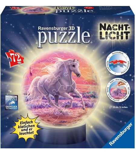 Pferdeliebhaber aufgepasst! Dieser 3D Puzzle-Ball wird mit einem Händeklatschen zum romantischen Nachtlicht, wenn der Leuchtsockel den Ball von innen erstrahlen lässt. Dank unserer Easyclick Technology passen alle Kunststoff-Puzzleteile perfekt ineinander und formen eine stabile Kugel, ganz ohne Kleben. Die Nummerierung der Teile erleichtert das Vorsortieren und ermöglicht einfaches Puzzeln nach Zahlen. ...