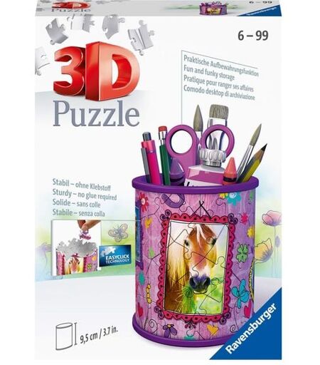 3D Puzzle Stiftehalter PferdeMädchenträume werden wahr – hier schlägt das Herz jeder Pferdeliebhaberin höher! Ob als Stiftebox, Geheimversteck oder modisches Deko-Accessoire, dieser verträumte Stifthalter mit tollen Pferdemotiven verzaubert jedes Kinderzimner – und natürlich jedes Pferdeherz! Dazu ist dieses 3D Puzzle super praktisch und lässt jeden Schreibtisch als aufgeräumt erscheinen. Wer hätte gedacht, dass man Träume puzzeln kann?Neben dem Sneaker, der Aufbewahrungsbox oder der Herzschatulle lässt jetzt auch das praktische Utensilo Herzen höher schlagen. Das 3D Puzzle mit tollen Pferdemotiven ist der perfekte Hingucker in jedem Kinderzimmer, der jedem Schreibtisch einen coolen Look verleiht! Und dabei ganz leicht zusammenbauen, denn die 54 dank EasyClick Technology perfekt passenden Kunststoff- Puzzleteile sind schon für Mädchen ab 7 Jahren problemlos zu puzzeln. Schließen Sie einfach das Puzzle ab, befestigen Sie die Plastikzubehörteile und verwenden Sie den Griff, um Stifte, Bleistifte, Make-up-Pinsel und verschiedene Kleinigkeiten aufzubewahren.Der stabile Stiftehalter im tollen Pferdedesign eignet sich zudem ideal als Mitbringsel oder Geburtstagsgeschenk für die beste Freundin. So schnell werden Mädchenträume wahr! ...