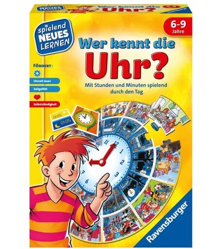 Bei dem Kinderspiel Wer kennt die Uhr? stellen sich Fragen wie: Welche Uhrzeit zeigt Pauls Wecker morgens beim Aufstehen? Oder wann hat Paul in der Schule Pause? Spielerisch verbinden Kinder Situationen aus ihrem Alltag mit der passenden Uhrzeit. Abwechslungsreiche Spielformen vermitteln auch Zeitbegriffe wie vor und nach. Die nächste Herausforderung für die Spieler: Die Zeit auf der großen Uhr richtig einzustellen. Wo muss der große Zeiger hin und wo hat der Kleine nun seinen Platz? Und auch die digitale Schreibweise spielt eine Rolle – wer kann denn 4.30 Uhr auf der Spiel-Uhr richtig einstellen?Die vier verschiedenen Spielvarianten bei diesem Brettspiel werden unterschiedlichen Entwicklungs- und Altersstufen gerecht und ermöglichen eine individuelle Förderung in den Bereichen Uhrzeit lesen, Zeitgefühl und Selbstständigkeit. Lernspiele, die richtig Spaß machen: So heißt das Motto der Lernspielreihe von Ravensburger, mit der Kinder in den lernintensivsten Jahren in ihrer Entwicklung unterstützt werden. Alle Spiele werden nach neuesten wissenschaftlichen und pädagogischen Standards entwickelt und geprüft. Die Lernstoffe sind in spannenden Geschichten verpackt, eine Vielfalt an Materialien und Methoden erlaubt das Lernen mit allen Sinnen. ...