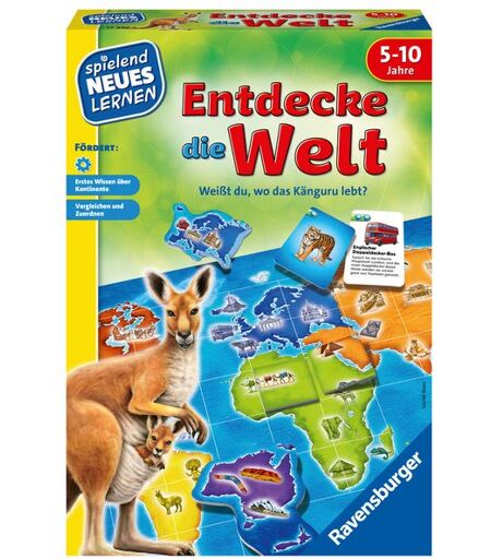 In dem Kinderspiel Entdecke die Welt stellen sich Fragen wie: Wo leben Zebra und Elefant? Wer kennt die Freiheitsstatue und wer weiß, wo die Pyramiden stehen? Viele Bilder laden 2-4 Kinder ein, die Erde zu entdecken und die Tiere den Kontinenten zuzuordnen. Die kleinen Entdecker vergleichen die Kärtchen mit dem Spielplan und finden die Orte der abgebildeten Motive. Anschließend vervollständigen die Kinder diese Bilder von Tieren oder Sehenswürdigkeiten, gewinnen so die meisten Punkte und nehmen den Sieg mit nach Hause.Dabei wiederholen sie ihre Zuordnung und prägen sich das Wissen über Geographie oder die Heimat der Tiere ein. Ganz ohne Text für eine erste Orientierung auf der Weltkarte oder mit zusätzlichen Informationen auf den Rückseiten der Motivkarten wächst das Spiel mit den Kindern mit. Lernspiele, die richtig Spaß machen: So heißt das Motto der Lernspielreihe von Ravensburger, mit der Kinder in den lernintensivsten Jahren in ihrer Entwicklung unterstützt werden. Alle Spiele werden nach neuesten wissenschaftlichen und pädagogischen Standards entwickelt und geprüft. Die Lernstoffe sind in spannenden Geschichten verpackt, eine Vielfalt an Materialien und Methoden erlaubt das Lernen mit allen Sinnen. ...