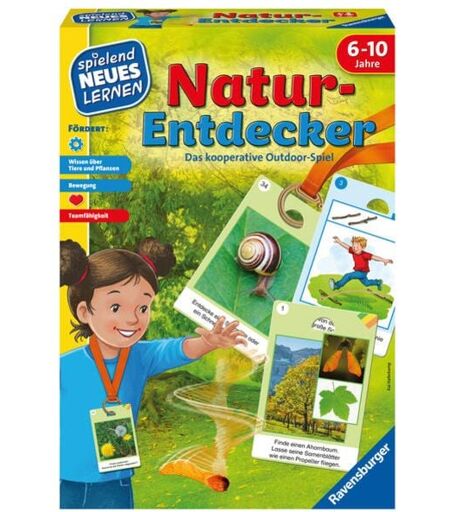 Im Kinderspiel Natur-Entdecker erforschen 1-6 Kinder von 6-10 Jahren ihre Umwelt. Hier geht es raus in die Natur: Das Spiel enthält Entdecker-Aufgaben und Outdoor Spiele für Kinder, die im Wald, auf der Wiese oder im Park gespielt werden können. Die gemeinsame Suche nach Blumen, Blättern, Vögeln oder Insekten birgt manches Abenteuer für Kinder. Anschließend können sich die Spieler in einem Bewegungsspiel, Geschicklichkeitsspiel oder einer kreativen Aktivität als Team beweisen. Mit einer Vielzahl an Aufgaben und Spielen erleben Kinder bei Natur-Entdecker immer Neues an verschiedenen Orten und zu jeder Jahreszeit. Die 60 Entdecker-Aufgaben sind so zusammengestellt, dass es für jedes Wetter und jede Umgebung passende Karten gibt. Es ist ein Ausflug ans Wasser geplant? Vielleicht gibt es dort Enten oder man findet bestimmte Baumarten, wie die Erle. Moos, Spuren am Boden, Wolken am Himmel - was gibt es beim nächsten Spaziergang zu entdecken? Auch für den Spielplatz oder den Schulhof gibt es passende Karten. Pro Runde wählen die Spieler sechs Entdecker-Karten, von denen sie mindestens vier gemeinsam erfüllen. Ist eine Karte geschafft, darf sie an das Stoffband gehängt werden. Zum Schluss gibt es noch ein gemeinsames Spiel wie etwa Zapfenweitwurf oder Steinturmbauen. Wer kommt mit in die Natur? ...