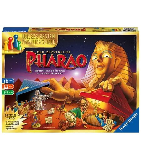 Suchen, schieben, Wege finden. Wo ist die Trompete der Nofretete? Der steinreiche, aber schusselige Pharao hat jede Menge Schätze verstreckt und vergessen wo er sie vergaben hat. Im beliebten Familienspiel Der zerstreute Pharao bahnen sich die Spieler als mutige Schatzsucher den Weg durch die Pyramiden, um mit Grips und Glück die Schätze des Pharaos zu finden.Achtung vor dem Sandsturm! Er kann das Spielbrett um 90 Grad drehen und pures Chaos verursachen. Hinzu kommen Flüche und natürlich die gefürchtete Mumie. Das Spiel Der zerstreute Pharao verläuft jedes Mal anders, da sich der Spielplan variabel aufbauen lässt. Profi-Schatzsucher gehen in einer Extra-Variante auf die Suche nach Forscher-Kollegen. Diese haben sich in den Pyramiden verlaufen. Je mehr Forscher die Spieler unter den Pyramiden finden, desto besser. Doch immer gilt: Vorsicht vor den Mumien, sie lähmen die Spieler für eine Runde. Übrigens macht Der zerstreute Pharao auch als Einzelspiel viel Spaß: Je mehr Schätze gefunden werden, desto klangvoller ist der Titel, den der Pharao dem Schatzsucher verleiht - die Skala reicht von Wüstenkäfer über Kameltreiber bis zum Hohepriester oder sogar Pharao. ...
