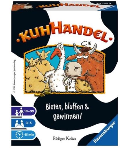3,2,1 – verkauft! Wer bietet am meisten? Und wer zieht seine Mitspieler so richtig über den Tisch? Nur wenn die Spieler im richtigen Moment steigern, sichern sie sich die dicksten Viecher und damit die meisten Punkte. Geld ist am Ende nichts mehr wert. Bei Spielbeginn fängt der Spieler mit dem schwersten Haustier an. Danach läuft das Spiel reihum. Wer an der Reihe ist, entscheidet sich entweder für Versteigerung oder Kuhhandel.Anschließend ist der nächste Spieler an der Reihe. Er entscheidet sich wiederum für eine der beiden Aktionen etc.Das Kartenspiel für 3-5 Spieler ist kurzweilig, macht jede Menge Spaß. Es ist durch das praktische Reiseformat super zum Mitnehmen geeignet. Auch perfekt für jeden Spieleabend mit der Familie oder Freunden. Außerdem ist Kuhhandel auch ein tolles Geschenk für Kinder und Erwachsene ab 10 Jahren zu Anlässen wie Weinachten, Geburtstag oder Ostern. ...
