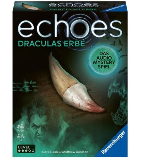 Menschen verschwinden spurlos aus einem kleinen Dorf in Transsilvanien. Ist der grausame Vampir Dracula zurückgekehrt? Die Spieler nehmen die Fährte des Monsters auf und versuchen, die Wahrheit herauszufinden.echoes ist ein einzigartiges, kooperatives Audio Mystery Spiel. Die Spieler hören mithilfe der kostenlosen Ravensburger echoes App mysteriöse Geräusche und Stimmen, die mit den Kartenmotiven verbunden sind. Gemeinsam bringen sie die 24 Teile der Geschichte in die richtige Reihenfolge, um den Fall zu lösen.Die kostenlose Ravensburger echoes App wird zum Spielen benötigt. Im Lauschen-Modus der App können die Spieler die Sounds abspielen. Im Lösen-Modus überprüfen die Spieler jeweils vier Karten auf ihre Reihenfolge, um Kapitel für Kapitel zu lösen. Zum Schluss müssen die Spieler die gesamte Geschichte in die richtige Reihenfolge bringen, um den Fall zu lösen.Für ein optimales Spielerlebnis mit Kamera-Erkennung wird ein Gerät mit folgenden Anforderungen benötigt: Mindestens iPhone 6s mit iOS 12.0 oder neuer / Android-Gerät mit mindestens Android 7.0 und kompatibel mit den Google-Play-Diensten für AR (Diese können auf manchen Geräten nachträglich installiert werden). Falls das Gerät diese nicht erfüllt, kann per manueller Eingabe gespielt werden. ...