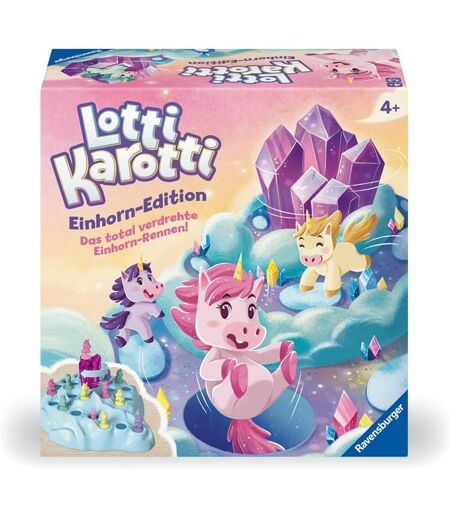 Seit Jahrzehnten begeistert der Spiele-Klassiker Lotti Karotti ganze Familien. Nun lässt die Einhorn-Edition des beliebten Gesellschaftsspiels Kinderherzen höher schlagen. Ziel bei diesem Wettlauf-Spiel ist der magische Kristall, der oben auf dem Wolkenberg funkelt. Wer ihn mit einem seiner Einhörner zuerst erreicht, gewinnt. Doch der Weg hinauf steckt voller Überraschungen! Während des Spiels wird der Kristall immer wieder gedreht. Dadurch öffnen sich Löcher, in die die Einhörner fallen können.In dieser Ausgabe des Lotti Karotti Spiele-Klassikers laufen 16 niedliche Einhörner in hübschen Pastelltönen um die Wette. Ziel ist der magische Kristall, der oben auf dem Wolkenberg funkelt. Nacheinander decken die Spieler Karten auf, die bestimmen, wie weit die Einhörner entlang dem Wolkenpfad gezogen werden dürfen. Wer die Kristallkarte zieht, darf den Kristall drehen und verändert damit dem Weg. Sicher geglaubte Lauffelder öffnen sich plötzlich und - plumps - fällt das eine oder andere Einhorn hinein. Der einzigartige Spielmechanismus sorgt für anhaltende Spannung von der ersten bis zur letzten Minute. Dieses Spiel begeistert aufgrund seiner einfachen Regeln bereits Kinder ab 4 Jahren und ist damit das ideale Familienspiel für gemütliche Spielenachmittage. Ein ideales Geschenk zu Ostern, Weihnachten oder zum Geburtstag. ...